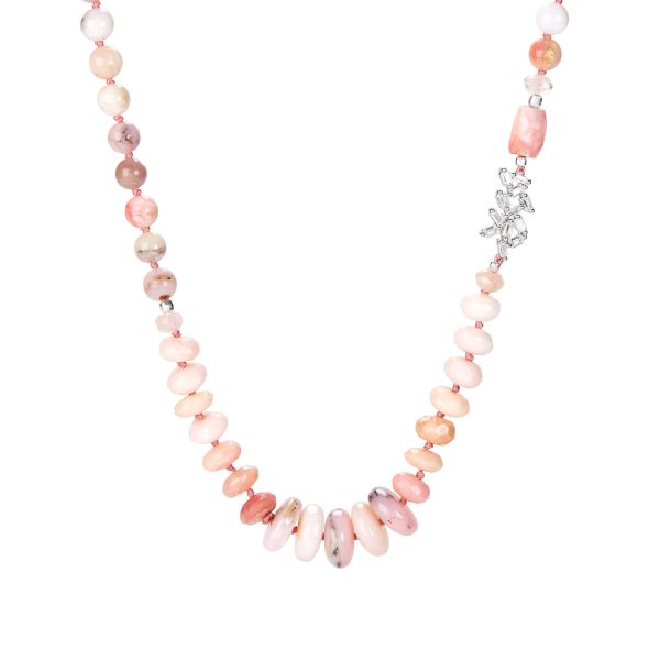 El collar de ópalo rosa y morganita degradados con plata es una de las joyas que pertenecen a la colección Perseida. Este collar corto es muy especial. Se ha montado de forma artesanal con la técnica del anudado entre pieza y pieza para poder proteger cada una de las gemas que contiene del roce. El mineral protagonista de este collar es sin duda el ópalo tallado de diferentes formas y de distintas tonalidades de rosa al que se le han añadido algunas piezas de morganita traslúcida en tonalidad rosada. La pieza que resalta está realizada con plata 925 bañada en rodio y montada con circonitas blancas. El cierre así como las demás piezas están realizadas con plata 925.