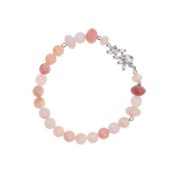 La pulsera de ópalo rosa y motivo de plata con circonitas pertenece a la colección Perseida. La pulsera está montada de forma artesanal con elástico resistente con varios minerales como son el ópalo rosa y algunas piezas de morganita. Además, el diseño incluye pequeñas piezas de plata 925 y un motivo central de plata 925 bañada en rodio con circonitas blancas.